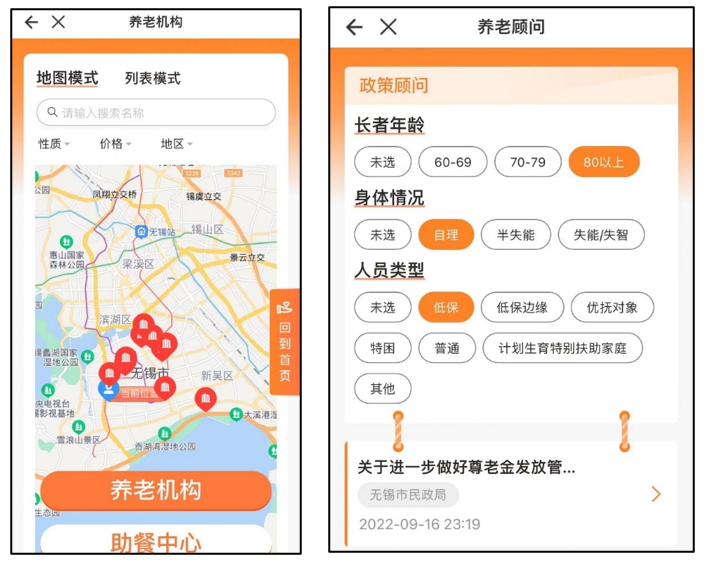 1.加强智慧康养理念的政策引领。早在2014年,无锡市就出台《智慧无锡建设三年行动纲要(2014-2016年)》,把智慧养老作为全市25个重点工作之一优先推进,并确定了“11311”智慧养老建设规划。2018年,研究出台《无锡市养老服务项目补贴办法》等扶持政策,明确对智慧化建设项目给予重点资金扶持。2019年,牵头编制并发布实施国内首个智慧养老省级标准《智慧养老建设规范》。2021年,入选国家智能社会治理实验特色基地(养老)名单。2022年,在“灵锡”APP上线了全市首个养老地图——“锡心养一张图”。