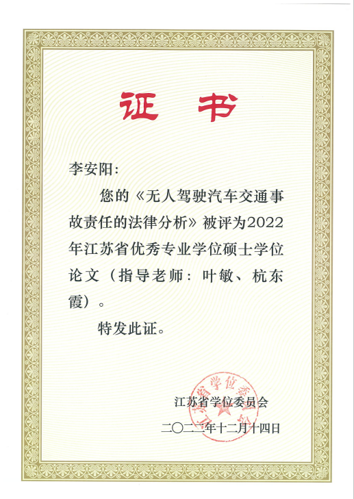 近日,江苏省学位委员会、江苏省教育厅公布2022年江苏省优秀博士硕士学位论文评选结果,我院叶敏、杭东霞老师指导的2018级法律(非法学)专业研究生李安阳的学位论文《无人驾驶汽车交通事故责任的法律分析》被评为“2022年江苏省优秀专业学位硕士学位论文”。